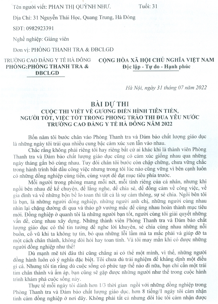 Giải Nhì Cuộc thi Viết về Gương điển hình tiên tiến, người tốt việc tốt của Trường Cao đẳng Y tế Hà Đông năm 2025 (4/22/2025 12:00:00 AM)