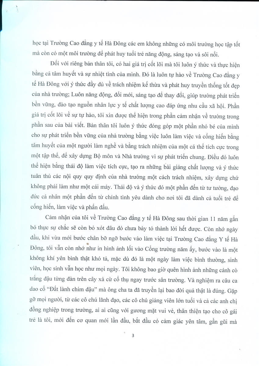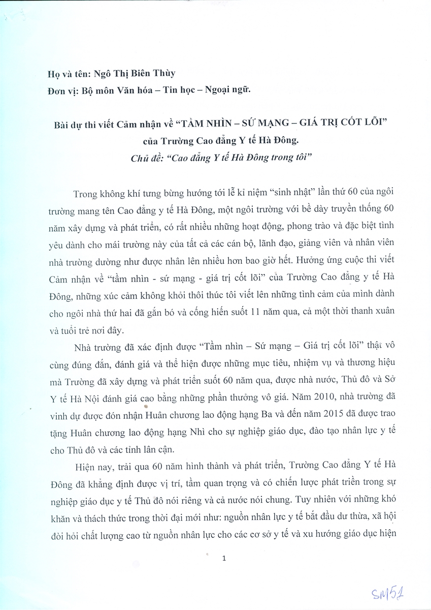 Người viết dự thi:Ngô Thị Biên Thùy, Bộ môn VHTHNN, viết về "Tầm nhìn-Sứ mạng-Giá trị cốt lõi" Trường Cao đẳng Y tế Hà Đông
