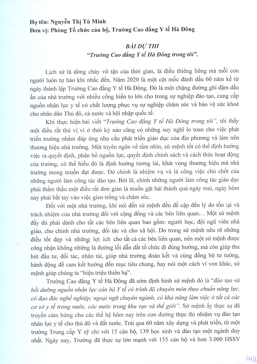 Bài viết dự thi "Trường Cao đẳng Y tế Hà Đông trong tôi"