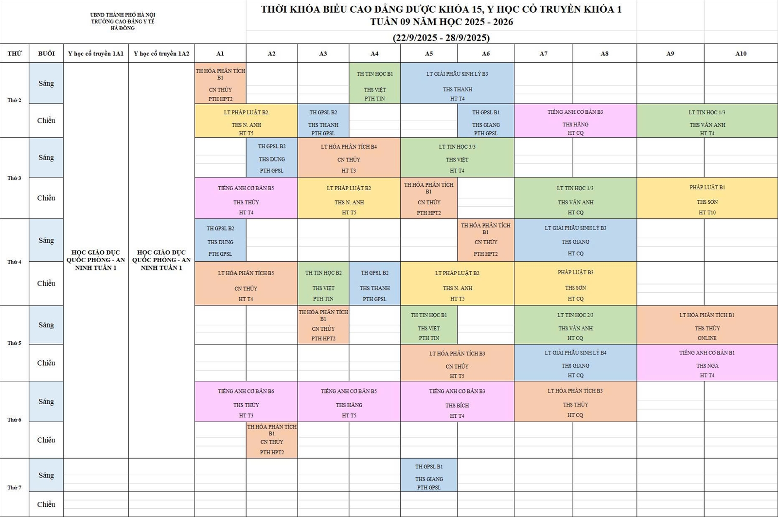 Cập nhật Lịch học Cao đẳng Y học cổ truyền K1, Dược K15. Tuần 09 (22/09/2025 - 28/09/2025)