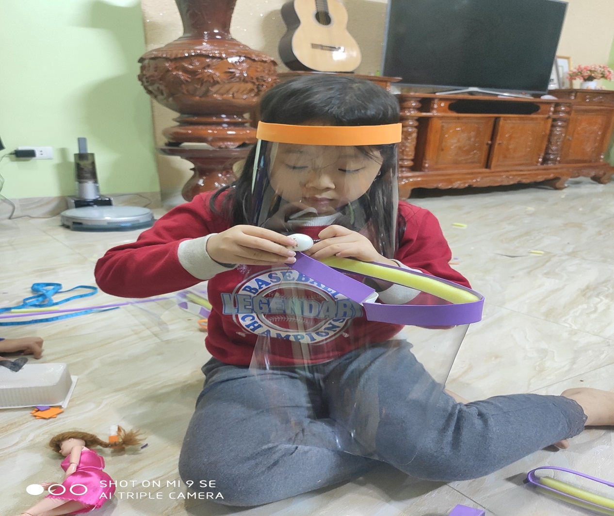 Các em học sinh tự làm mũ kính chắn bọt theo cô Thảo hướng dẫn