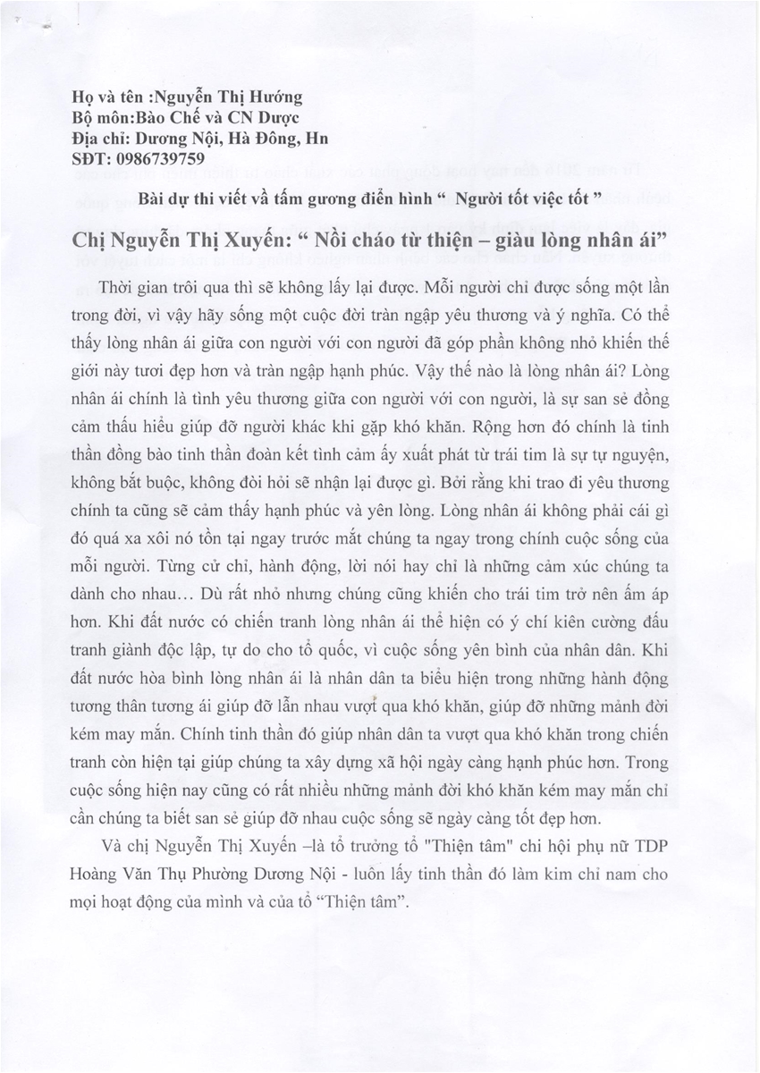 Bài dự thi: Chị Nguyễn Thị Xuyến: "Nồi cháo từ thiện - giàu lòng nhân ái" - Tác giả: Nguyễn Thị Hướng - Bộ môn Bào chế và CN Dược