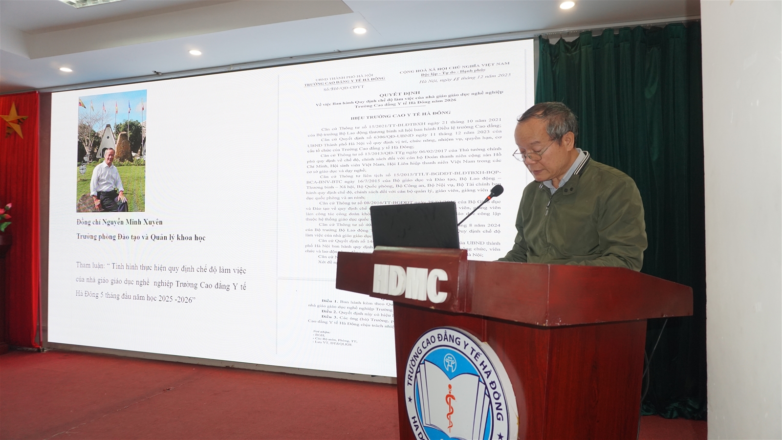 Đồng chí Nguyễn Minh Xuyên, Trưởng phòng Đào tạo và Quản lý khoa học với bài tham luận: “Tình hình thực hiện quy định chế độ làm việc của nhà giáo giáo dục nghề nghiệp Trường Cao đẳng Y tế Hà Đông 5 tháng đầu năm học 2025 – 2026”.