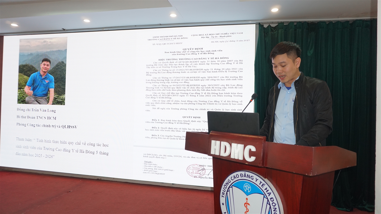 Đồng chí Trần Văn Long, Bí thư Đoàn TNCS Hồ Chí Minh, Phòng Công tác chính trị và Quản lý học sinh sinh viên với bài tham luận: “Tình hình thực hiện quy chế về công tác học sinh, sinh viên của Trường Cao đẳng Y tế Hà Đông 5 tháng đầu năm học 2025 – 2026”.