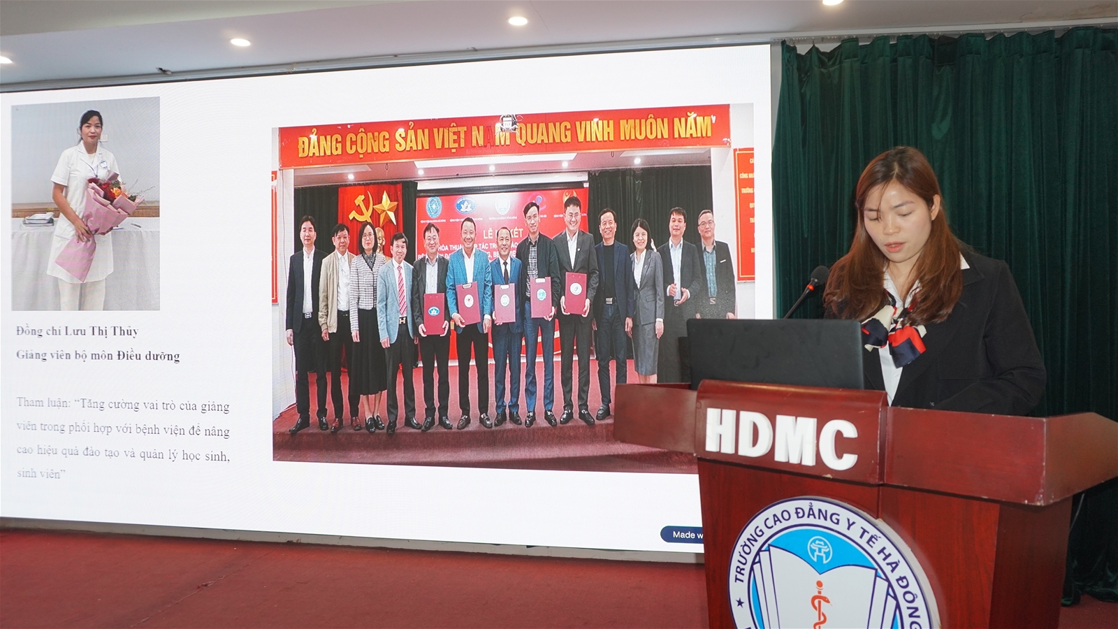 Đồng chí Lưu Thị Thủy, Giảng viên Bộ môn Điều dưỡng với bài tham luận: “Tăng cường vai trò của giảng viên trong phối hợp với bệnh viện để nâng cao hiệu quả đào tạo và quản lý học sinh, sinh viên”.