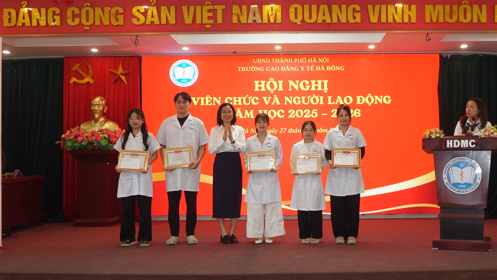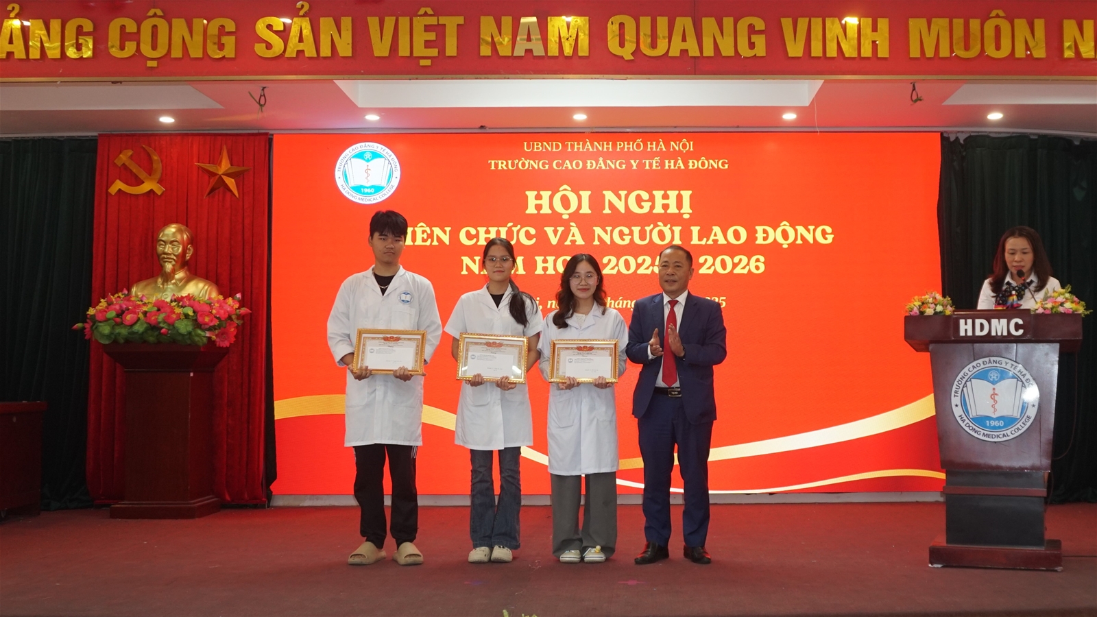 Trong khuôn khổ hội nghị, nhà trường cũng tổ chức lễ công bố và trao khen thưởng cho các cá nhân, tập thể đạt thành tích xuất sắc trong các hoạt động chào mừng kỷ niệm 65 năm ngày thành lập Trường Cao đẳng Y tế Hà Đông (26/10/1960 – 26/10/2025).