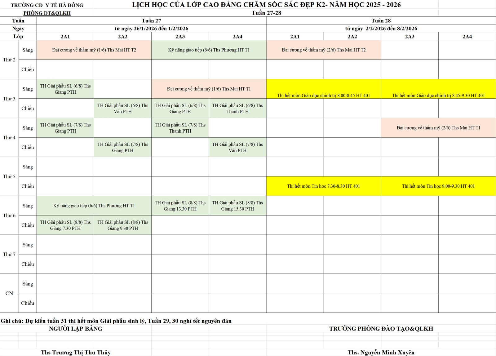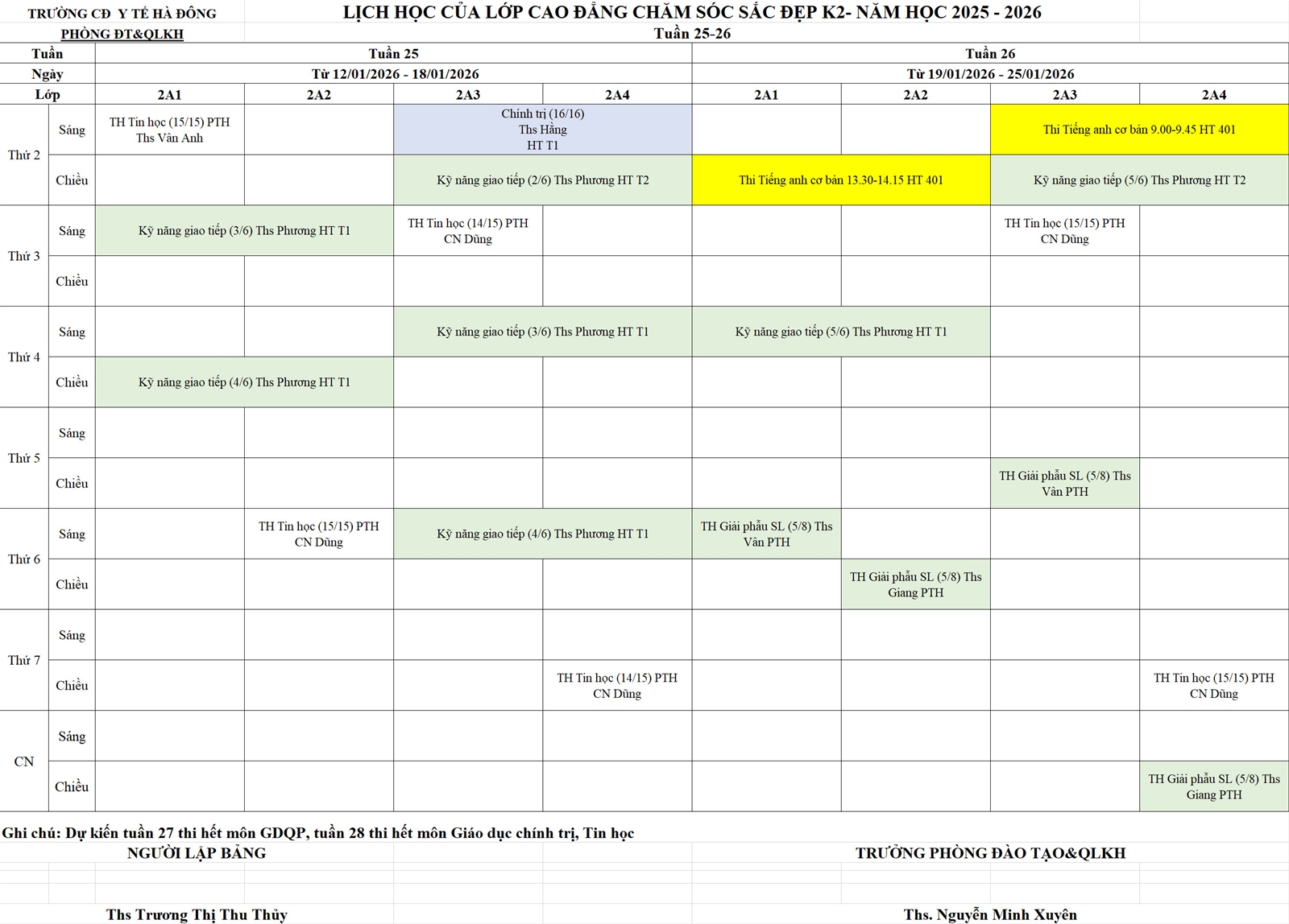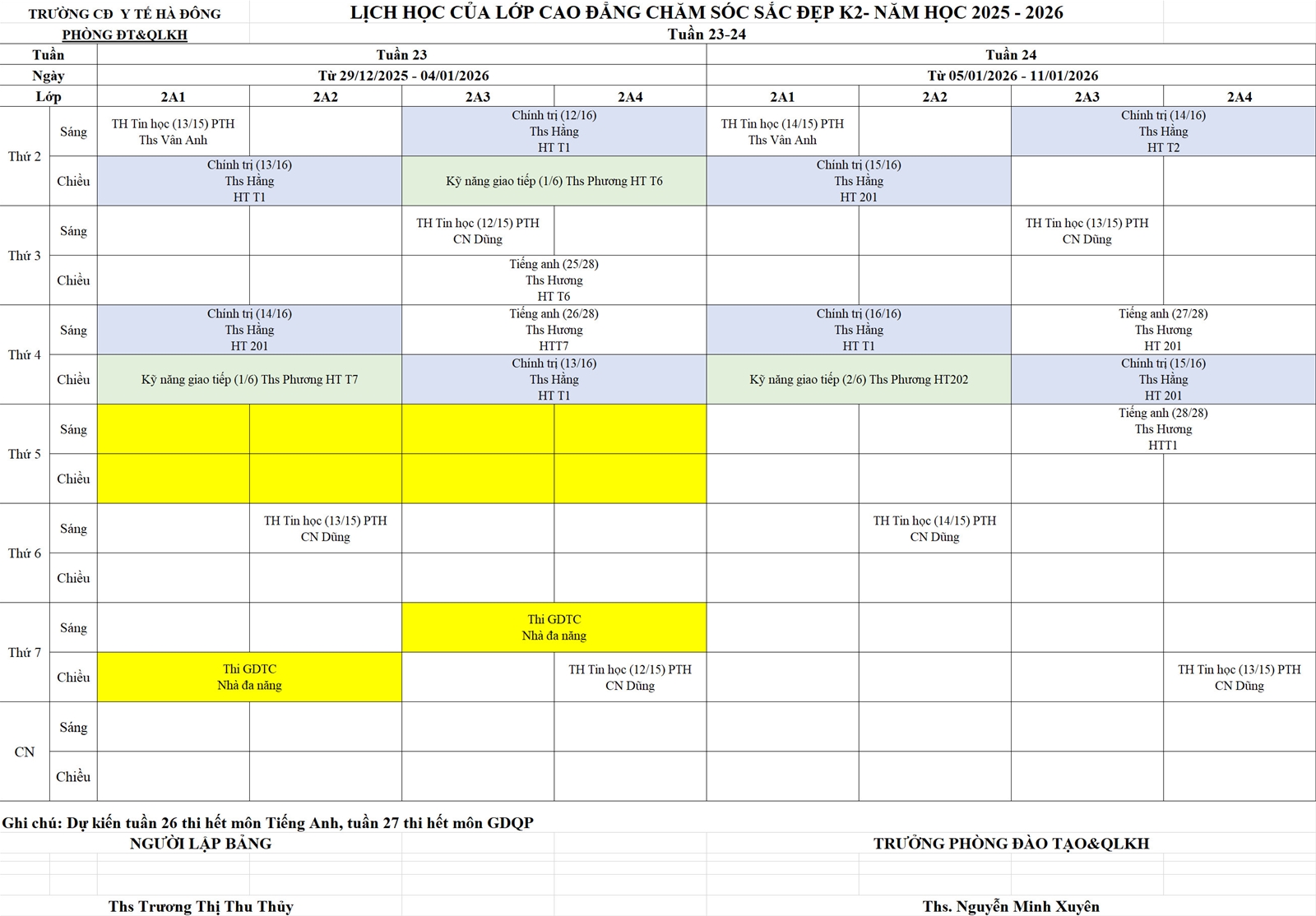 Lịch học Cao đẳng Chăm sóc Sắc đẹp K2. Tuần 23 - 28 (29/12/2025 - 08/02/2026)