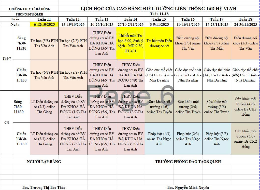 Lịch học Cao Đẳng Điều Dưỡng Liên Thông Khoá 16 Hệ VLVH. Tuần 11 - 18 (06/10/2025 - 30/11/2025)