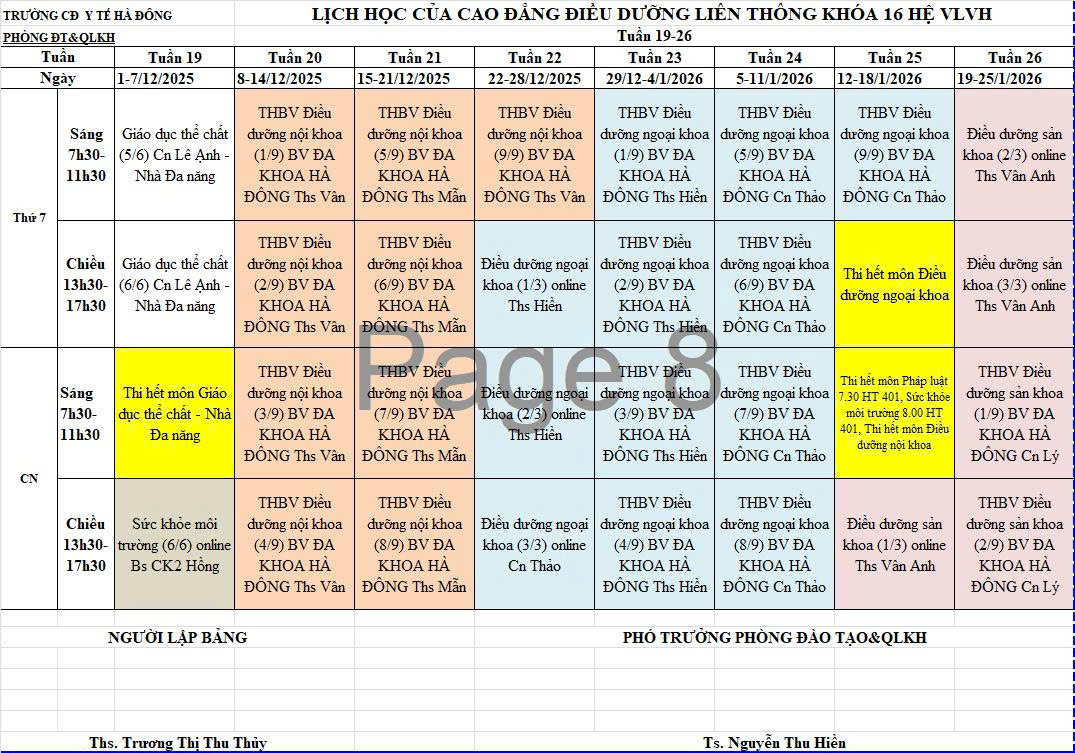 Lịch học Cao Đẳng Điều Dưỡng Liên Thông Khoá 16 Hệ VLVH. Tuần 19 - 26 (01/12/2025 - 25/01/2026)