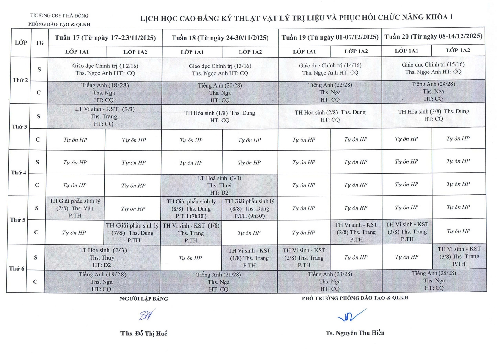 Lịch học Cao đẳng KT Vật lý trị liệu và Phục hồi chức năng K1. Tuần 17 - 20 (17/11/2025 - 14/12/2025)