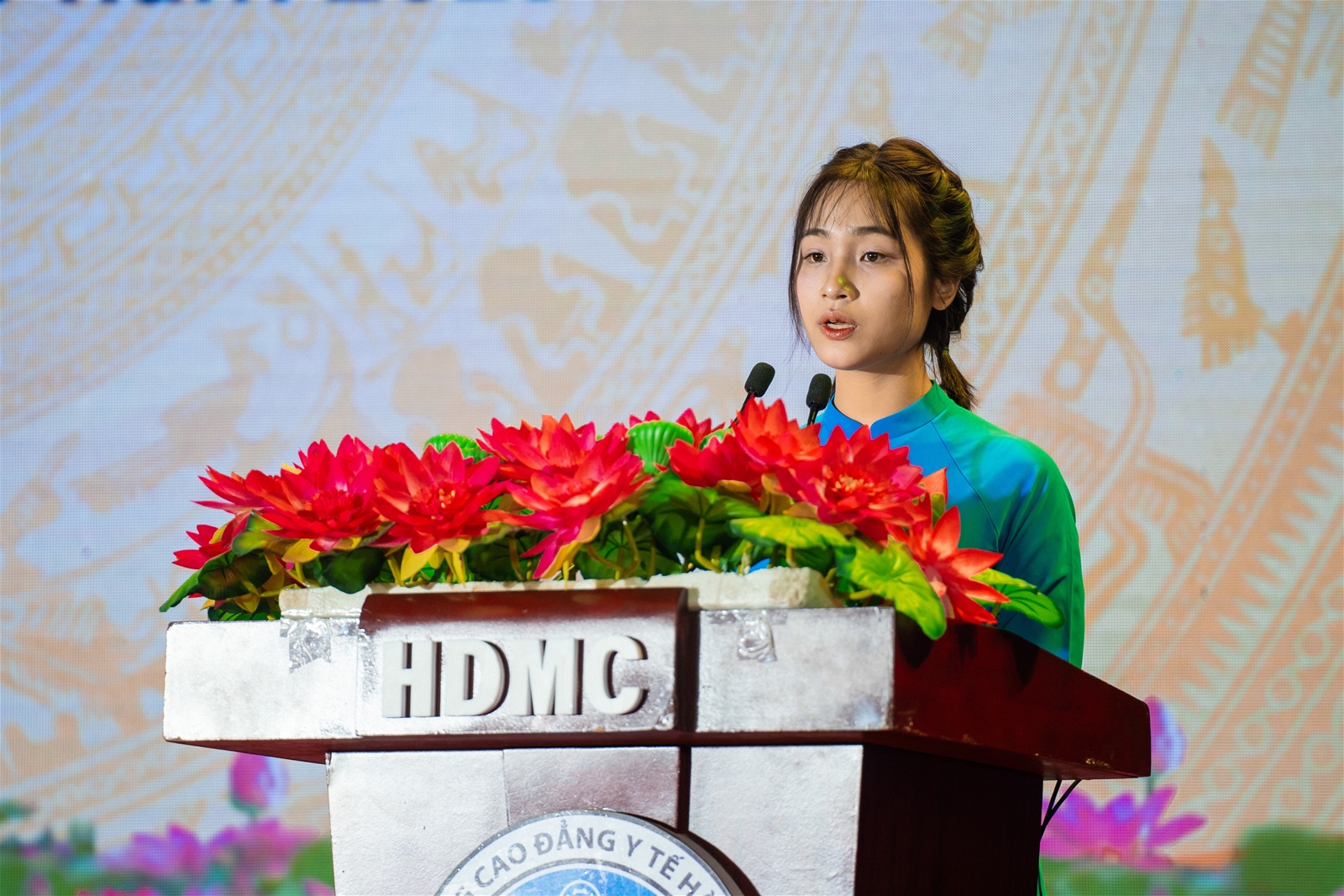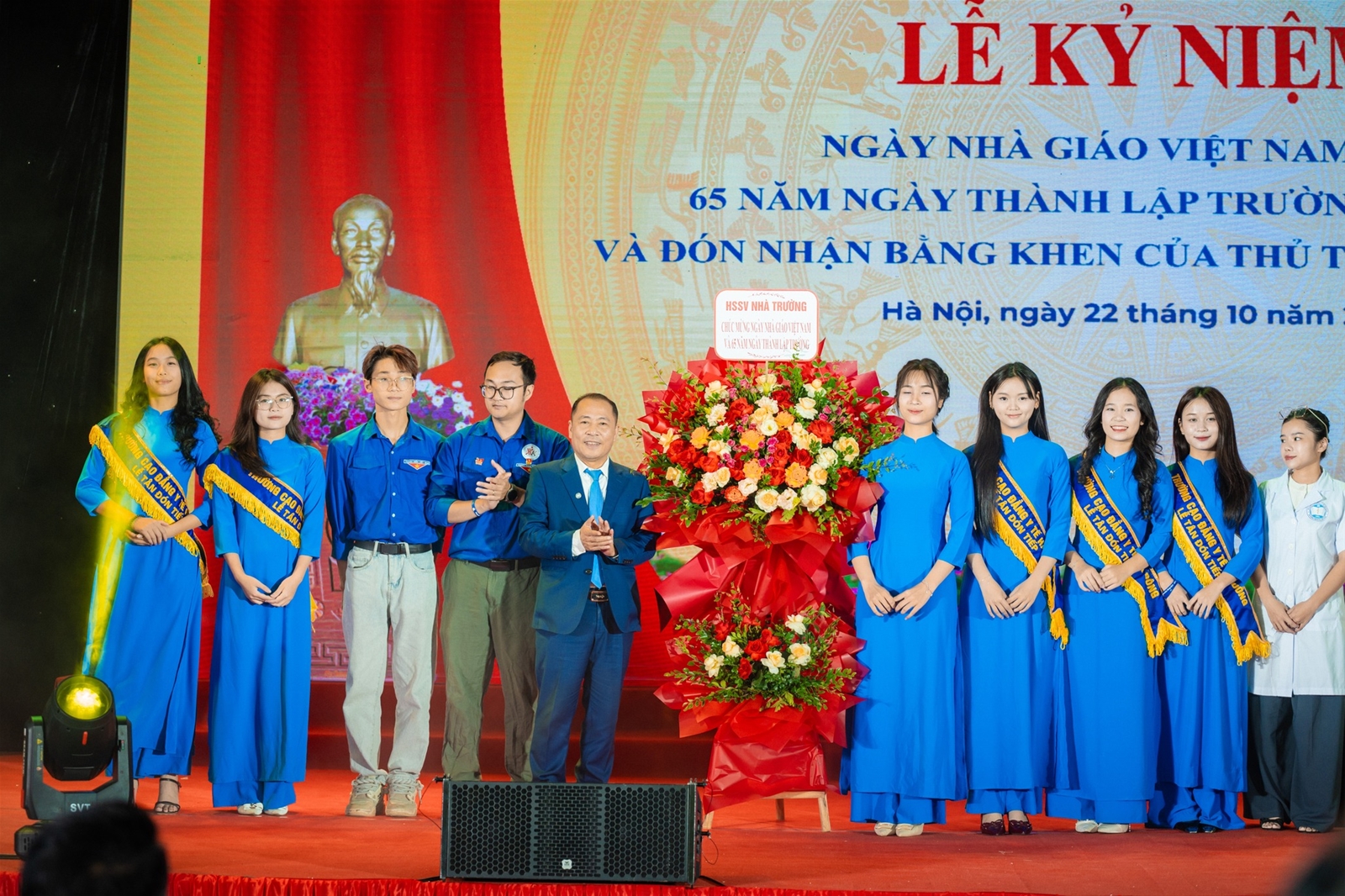 Đại diện cho thế hệ trẻ Trường Cao đẳng Y tế Hà Đông, sinh viên Lê Thị Loan – lớp Cao đẳng Chăm sóc sắc đẹp K2 đã phát biểu bày tỏ niềm tự hào khi được học tập trong mái trường giàu truyền thống, gửi lời tri ân sâu sắc tới các thầy cô giáo đã tận tâm dìu dắt, truyền đạt tri thức và ngọn lửa nghề y. Nhân dịp này, đại diện học sinh – sinh viên Nhà trường đã kính tặng những bó hoa tươi thắm tới Ban Giám hiệu, thể hiện lòng biết ơn, sự kính trọng và quyết tâm tiếp bước các thế hệ đi trước, góp phần xây dựng Trường Cao đẳng Y tế Hà Đông ngày càng phát triển, xứng đáng với truyền thống 65 năm “Nối tiếp truyền thống – Vươn tầm cao mới”.